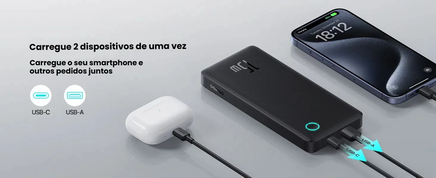 ✅ Carrega 2 dispositivos simultaneamente (iPhone, Android, tablets e mais).